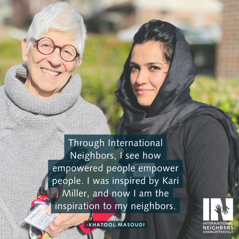 ¡Únete a mí hoy y haz una donación a Vecinos Internacionales! Sé de primera mano que tu donación ayudará a los refugiados y a los SIV que viven y trabajan en nuestra comunidad a prosperar.