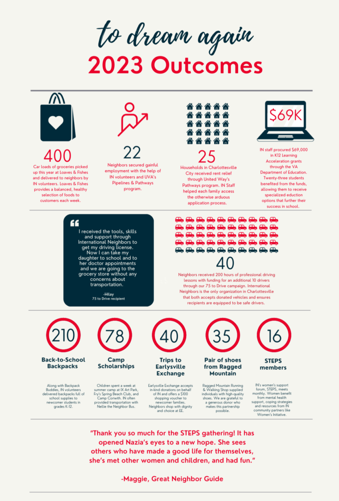 Hace unas semanas, recibimos esta referencia: “Heba y su familia tienen dificultades para subsistir en Charlottesville. Por favor, ayúdenlos con comida, ropa y alquiler”. Escuchamos historias como esta a diario. Debido a nuestra capacidad limitada, las listas de espera para todos nuestros programas y servicios han sido una realidad desde la fundación de Vecinos Internacionales. Aun así, soñamos con el día en que podamos servir a todos nuestros vecinos.
