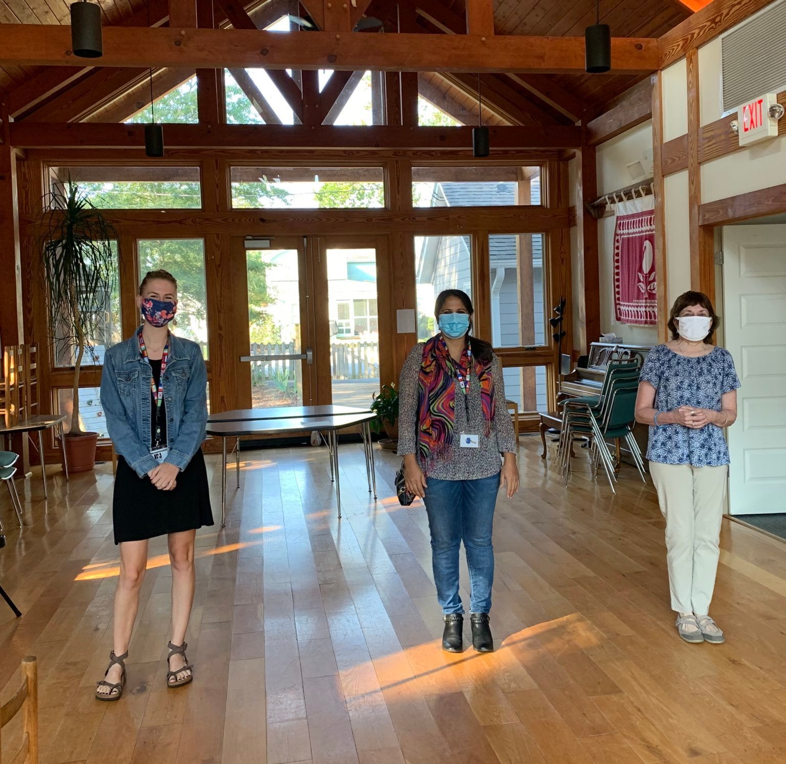 The “Dream Team,” (L to R) Marina Miller, Shahida Parveen, and Susanne Sachs, prepare to set up learning pods in the beautiful space donated by Charlottesville Friends Meeting House.