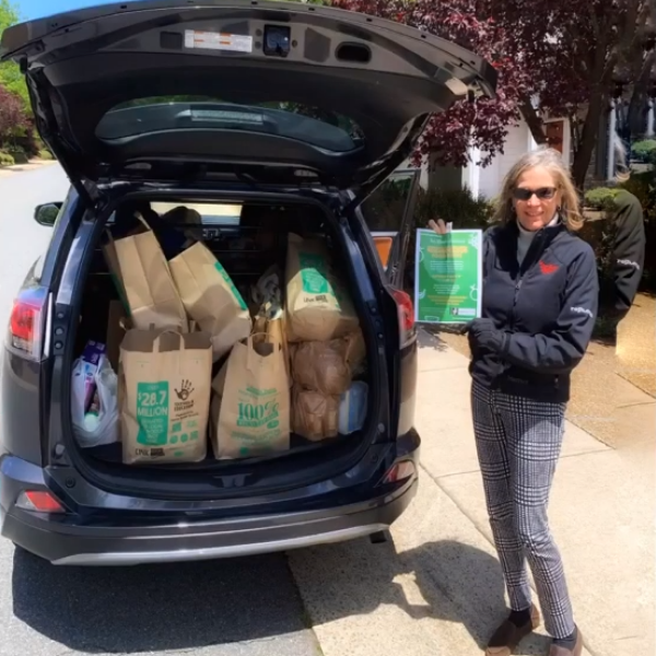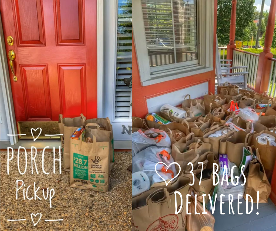 For example, many neighbors are facing food insecurity as a result of pandemic-related job loss. Becky decided to take direct action to address the issue, requesting donations via social media and good old-fashioned legwork, distributing flyers to her neighbors in Crozet’s Stone Gate at Western Ridge community, which includes about 55 single-family households. To maintain social distancing, she asked that neighbors leave their donations in grocery bags on their front porches or in their driveways. On Saturday, May 9, Becky and her husband Cory collected 37 bags of canned foods, boxed cereals, paper products, and more—and delivered them to IN’s front porch, bringing new meaning to “curbside delivery.”